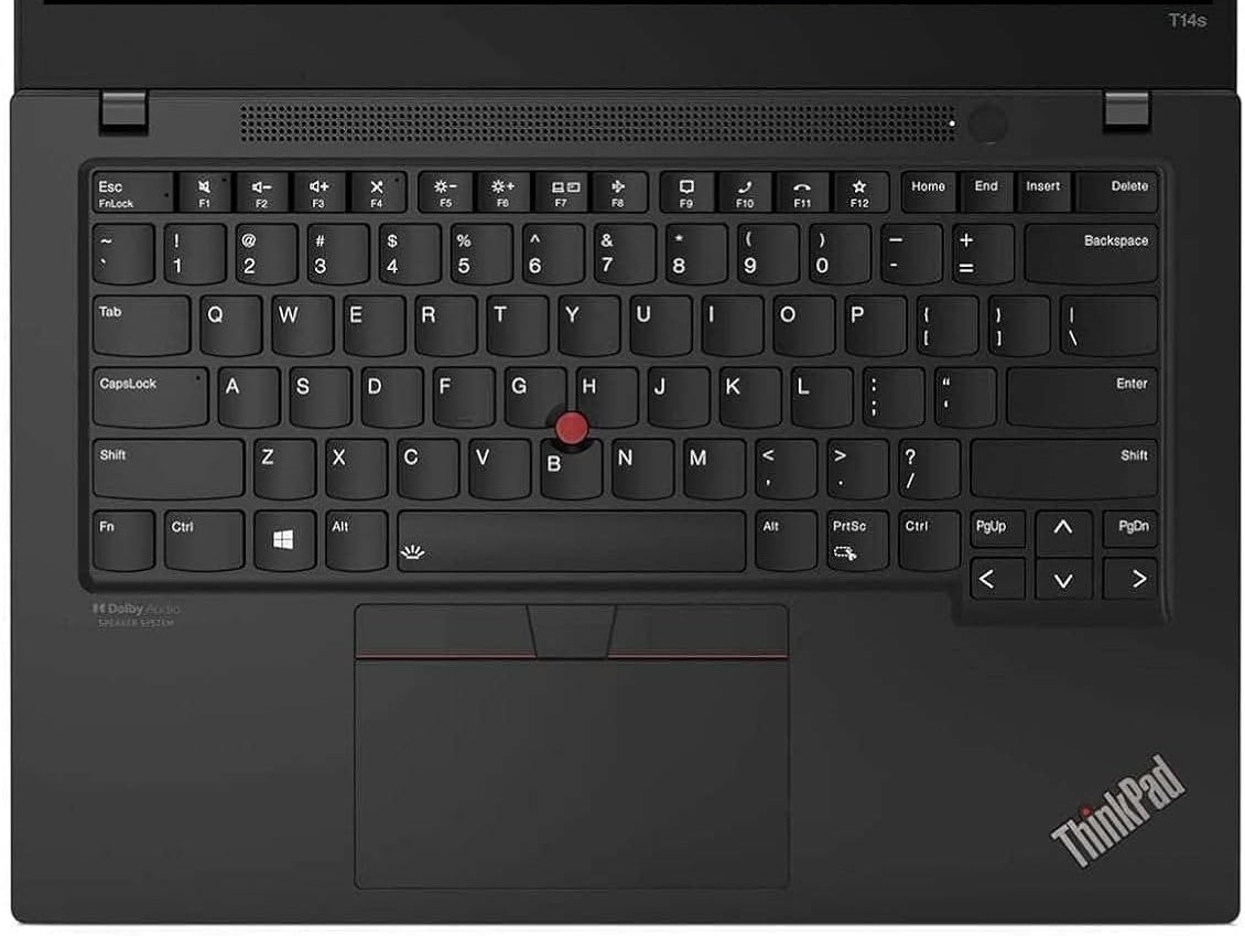⌨️ بهترین کیبورد دنیا: کیبورد ThinkPad T14s با فاصله ۱.۵ میلیمتری کلیدها، تجربهای از تایپ را ارائه میدهد که هیچ لپتاپ دیگری به گرد پای آن نمیرسد. وجود TrackPoint (دایره قرمز معروف) نیز کنترل موس را بدون برداشتن دست از روی کیبورد ممکن میسازد.