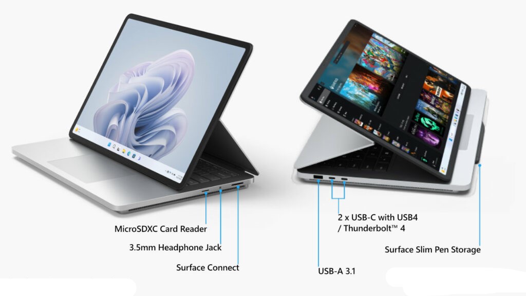 حالت استودیو (Studio Mode): با خواباندن کامل نمایشگر، دستگاه به یک بوم طراحی ارگونومیک و قدرتمند برای یادداشتبرداری و خلق آثار هنری با قلم سرفیس اسلیم ۲ (Surface Slim Pen 2) تبدیل میشود.